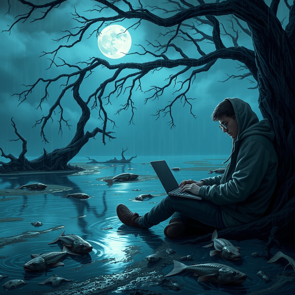 بارون میآد، شب شده، لجن و ماهیهای مرده دورش رو گرفتن... ولی او فقط به صفحهی لپتاپش خیره شده.